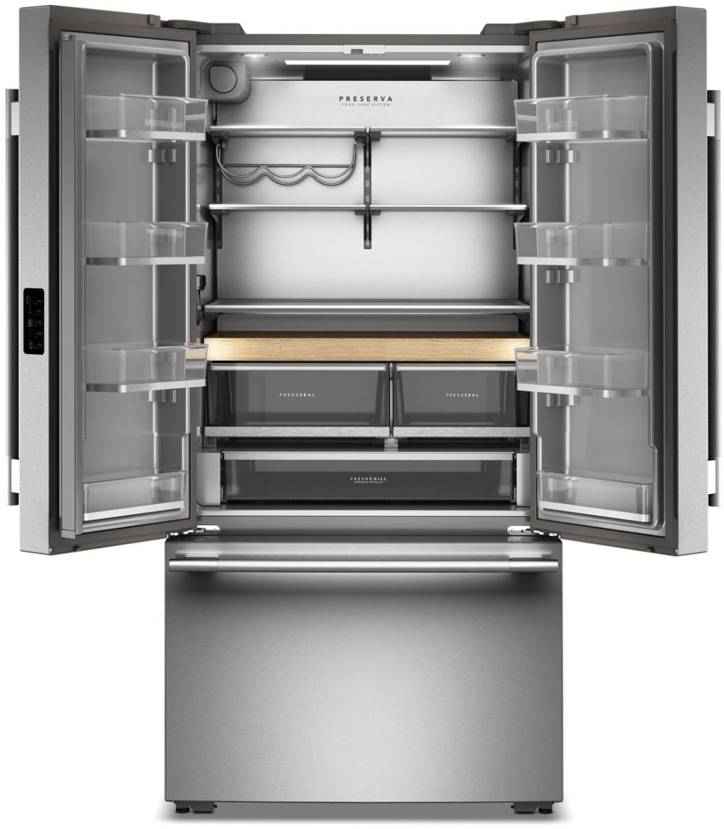 Feed your creativity with the KitchenAid French Door Bottom Mount Refrigerator with Internal Water Dispenser. Keep your food fresh and flavorful with the Preserva® Food Care System, FreshChill™ Temperature-Controlled Full-Width Pantry Drawer featuring temperature presets and FreshSeal™ Humidity-Controlled Crisper Bins. Plus, with True Counter Depth, and a number of finishes and hardware that are designed to be personalized, your refrigerator seamlessly fits into your kitchen with a seamless, built-in look. Not including doors when installed in standard 25 1/2" cabinet and countertopRead More